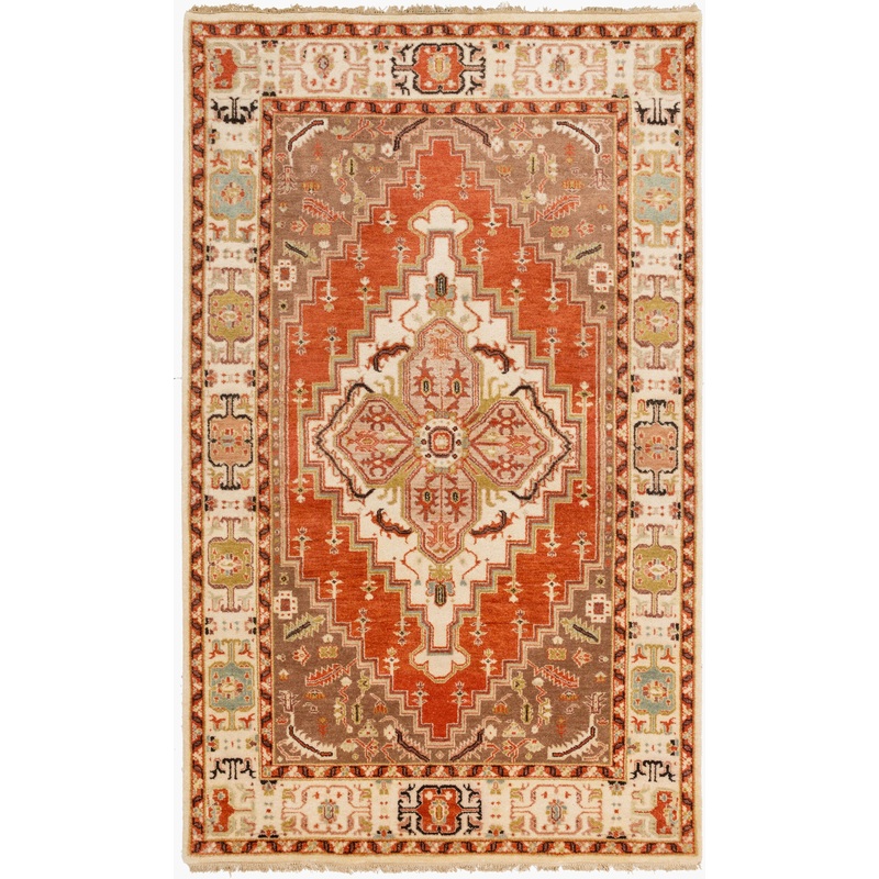 The Zeus Handmade Rug features a low pile and 1.5" fringe, blending subtle texture with artisanal detail. Its vibrant yet balanced color palette rust, wheat, brown, mauve, seafoam, navy, light olive, and coral aligns with TPX codes 18-1433, 13-0915, 17-122