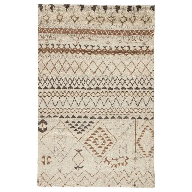 Modern Moroccan style defines the chic look of this artistically hand-knotted area rug. Crafted from hand-spun wool in neutral shades of cream, tan, and brown, it adds a soft, luxurious layer to any space. The geometric design blends an asymmetrical lattice pattern with eclectic triangle accents, creating a visually striking yet timeless piece perfect for contemporary or boho-inspired interiors.